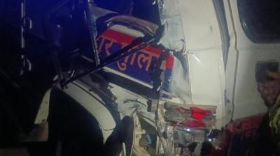 हाईवा की जोरदार टक्कर, रेलिंग से टकराने के बाद पुलिस गाड़ी में आग