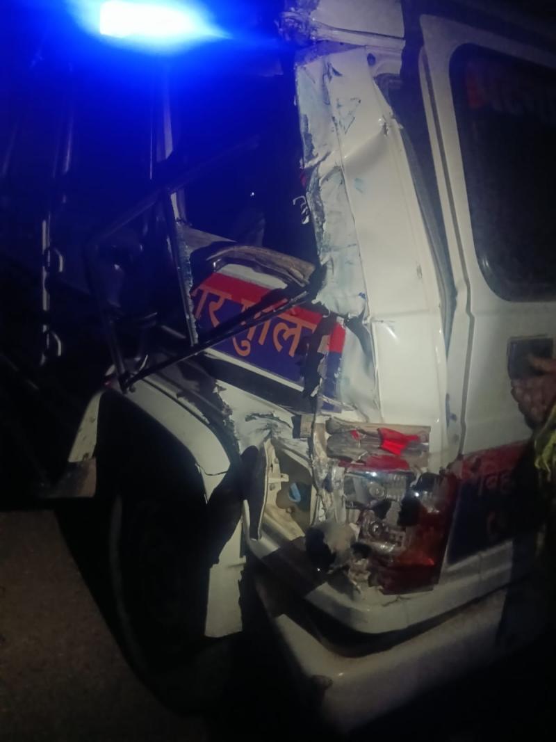 हाईवा की जोरदार टक्कर, रेलिंग से टकराने के बाद पुलिस गाड़ी में आग