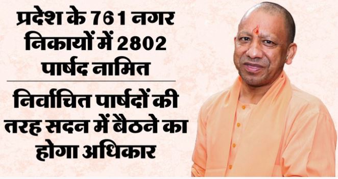 लखनऊ|लंबे इंतजार के बाद प्रदेश सरकार ने भाजपा संगठन की संस्तुति पर नगर निगम, नगर पालिका परिषद और नगर पंचायतों में पार्षदों को नामित कर दिया है। नगर विकास विभाग की ओर से जारी सूची के अनुसार प्रदेश के कुल 761 नगर निकायों में 2802 सदस्यों को नामित किया गया है। इनमें नगर निगमों में 10-10, नगर पालिका परिषद में 5-5 और नगर पंचायतों में 3-3 सदस्य नामित किए गए हैं।