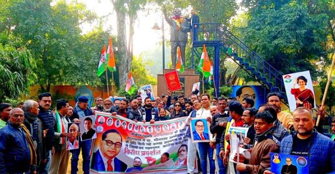 अलीगढ़ । केंद्रीय गृहमंत्री अमित शाह द्वारा राज्यसभा में बाबा साहब डॉ भीमराव अंबेडकर के प्रति की गई अभद्र टिप्पणी पर कांग्रेसजनों का विरोध प्रदर्शन निरंतर जारी है । इसी क्रम में हरियाणा प्रदेश कांग्रेस के पूर्व प्रभारी विवेक बंसल के नेतृत्व में कांग्रेसजनों ने मैरिस रोड से केंद्रीय गृहमंत्री अमित शाह व भाजपा सरकार के खि़लाफ़ एक विशाल जुलुस निकाला। मैरिस रोड से प्रारंभ इस जुलुस में कांग्रेस प्रदर्शनकारी हाथों बाबा साहब की तस्वीर लेकर गृहमंत्री अमित शाह के विरुद्ध भारी नारेबाजी करते हुए सेंटर पॉइंट चौराहा, समद रोड होते हुए समापन स्थल घंटाघर स्थित डा भीमराव अम्बेडकर पार्क पहुंचे । समापन स्थल पर विवेक बंसल ने बाबा साहब की प्रतिमा पर माल्यार्पण करके कांग्रेसजनों को संबोधित करते हुए कहा कि केंद्रीय गृहमंत्री अमित शाह और भाजपा के लोगों के दिल में न तो देश के संविधान के प्रति सम्मान है और न ही बाबा साहब के प्रति सम्मान है तभी गृहमंत्री भावावेश में अपनी भावनाओं को व्यक्त कर गये । हम लोग देश के संविधान व उसके रचियेता बाबा साहब डा० भीम राव अम्बेडकर का पूर्ण सम्मान करते हैं और संविधान की रक्षा के लिए पूरी ताक़त के साथ खड़े हैं, हम लोग बाबा साहब का अपमान नहीं होने देंगे और उनके द्वारा बनाये गए संविधान का पूरा सम्मान करेंगे।इस जुलुस में प्रमुख रूप से पूर्व प्रदेश महासचिव रूही ज़ुबैरी, कांग्रेस ज़िलाध्यक्ष ठाकुर सोमवीर सिंह, महानगर अध्यक्ष नवेद खान, शालिनी चौहान, शबनम बेगम, रौशनी सिंह, पूर्व अध्यक्ष सलाउद्दीन वसी, पूर्व अध्यक्ष तल्हा अबरार, शाहरुख़ खान, गोपाल मिश्रा, अमजद हुसैन, रईस खान बीडीसी, डा० राकेश सारस्वत, गौरव गुप्ता, अनिरुद्ध पुंढीर, ओमप्रकाश जी, कैलाश बघेल, पार्षद बिजेंद्र सिंह बघेल, आनंद बघेल, महेश गर्ग, बिरजू जाटव, ब्रजेश माथुर, बिहारीलाल सैनी, क़ुतुब उद्दीन, अमजद अली सिद्दीकी, शहजाद थे ।