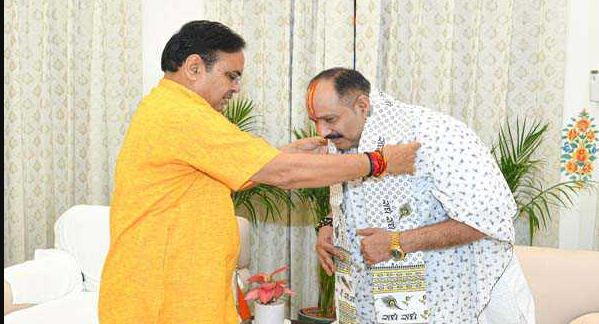 मुख्यमंत्री से मिलते हुए प्रसिद्ध कथावचक मिश्रा