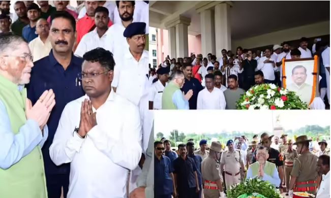 रांची । झारखंड के स्कूली शिक्षा एवं साक्षरता मंत्री रामदास सोरेन का बीते शनिवार को पंचतत्व में विलीन हो जाने से पूरे राज्य में गहरा शोक व्याप्त है। उनके पार्थिव शरीर का अंतिम संस्कार उनके आवास से करीब 2-3 किलोमीटर दूर धुआं कॉलोनी स्थित श्मशान घाट पर राजकीय सम्मान के साथ संपन्न हुआ। सोरेन के बड़े पुत्र सोमेश सोरेन ने मुखाग्नि दी। उनके पैतृक आवास गोड़ाबघा से अंतिम यात्रा निकाली गई, जिसमें पूरे इलाके के लोग शामिल हुए। लगभग डेढ़ से दो किलोमीटर तक चलने वाली इस यात्रा में बुजुर्ग, महिलाएं, युवा, बच्चे, समर्थक और शुभचिंतक सभी भावुक होकर उन्हें श्रद्धांजलि देने के लिए उमड़ पड़े। सड़क किनारे खड़े लोगों ने हाथ जोड़कर अपने प्रिय नेता को अंतिम विदाई दी। श्रद्धांजलि देते हुए लोग रामदास सोरेन अमर रहें और झारखंड तुम्हें याद करेगा जैसे नारों से गुंजित हो उठे। इस अवसर पर स्वास्थ्य मंत्री डॉ. इरफान अंसारी, मंत्री दीपिका पांडे सिंह, झामुमो के प्रदेश प्रवक्ता कुणाल सारंगी, विधायक मंगल कालिंदी, विधायक समीर मोहंती सहित कई वरिष्ठ राजनीतिक एवं सामाजिक हस्तियां भी मौजूद रहीं। रामदास सोरेन की पहचान एक सच्चे नेता और जनता के सेवक के