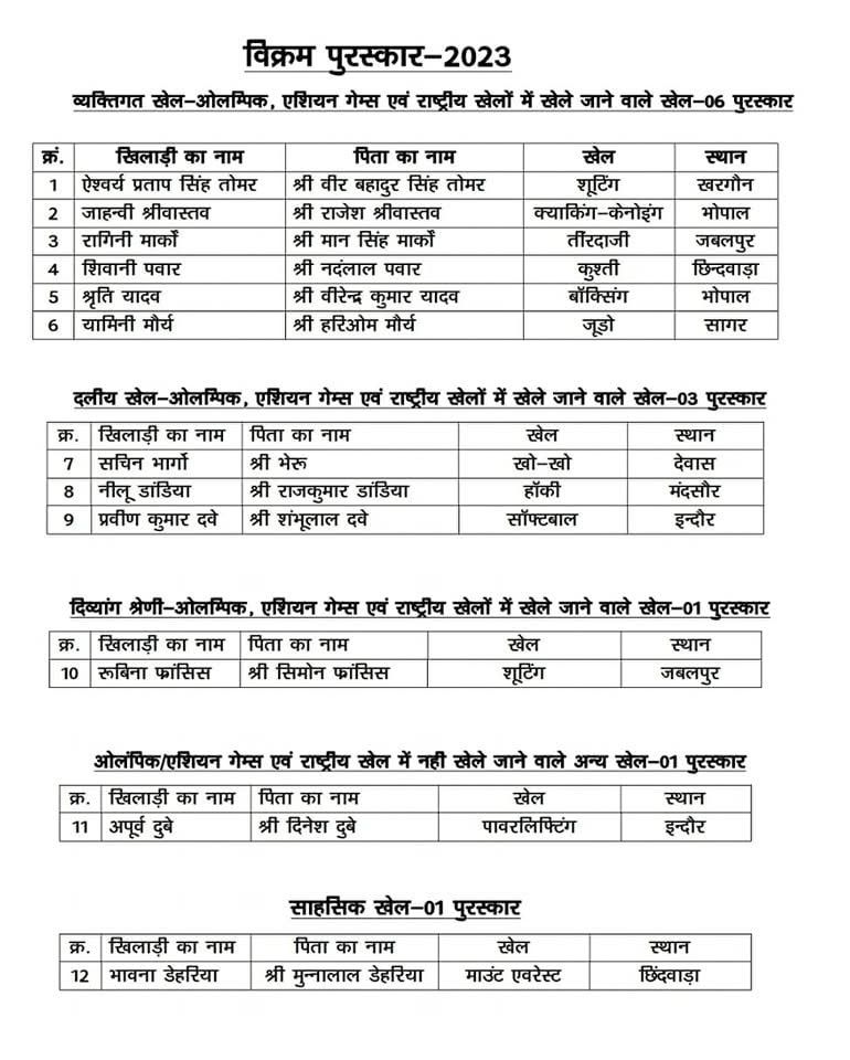 मध्यप्रदेश सरकार हर वर्ष खेल क्षेत्र में उत्कृष्ट प्रदर्शन करने वाले खिलाड़ियों, प्रशिक्षकों और खेल हस्तियों को विक्रम, एकलव्य, विश्वामित्र, लाइफटाइम अचीवमेंट एवं प्रभाष जोशी पुरस्कार से सम्मानित करती है। विक्रम पुरस्कार 2023 की सूची का ऐलान खेल और युवा कल्याण विभाग (DSYW), मध्यप्रदेश शासन द्वारा किया गया।