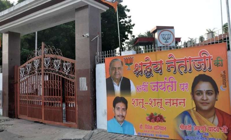 लखनऊ। यूपी में 20 नवंबर को उपचुनाव की वोटिंग है। सोमवार को प्रचार का आखिरी दिन है। रविवार को लखनऊ में सियासत की नई तस्वीर दिखी। प्रदेश भाजपा कार्यालय के मुख्य द्वार पर मुलायम सिंह यादव की बड़ी होर्डिंग लगी नजर आई। इसमें अपर्णा यादव की फोटो भी थी। अपर्णा मुलायम की छोटी बहू हैं।