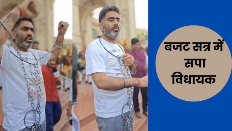 सपा विधायक हाथ पैरों में जंजीर पहनकर प्रदर्शन किया