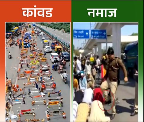 बुधवार को कांग्रेस के वरिष्ठ नेता दिग्विजय सिंह ने सोशल मीडिया साइट फेसबुक पर एक फोटो शेयर की। इसमें एक तरफ रास्ते में कांवड़ रखा हुआ है। वहीं दूसरी ओर सड़क पर लोग नमाज पढ़ रहे हैं जिन्हें पुलिसकर्मी लात मार रहे हैं। इस फोटो के नीचे ‘एक देश, दो कानून!’ लिखा हुआ है।