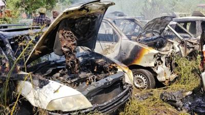 फोर्टिस अस्पताल के समीप थाने में लगी आग, 10 कारें जलकर खाक, फायर ब्रिगेड ने समय रहते नियंत्रण पाया